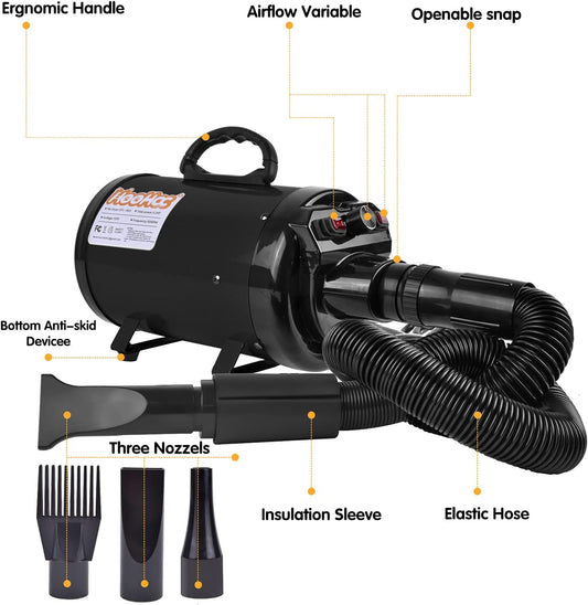 Dog Dryer, High Velocity Dog Hair Dryer, Dog Blow Dryer - Groomer Partner Pet Blower Grooming Force Dryer with Heater, Stepless Adjustable Speed, 4 Different Nozzles, Comb & Pet Grooming Glove (Black)